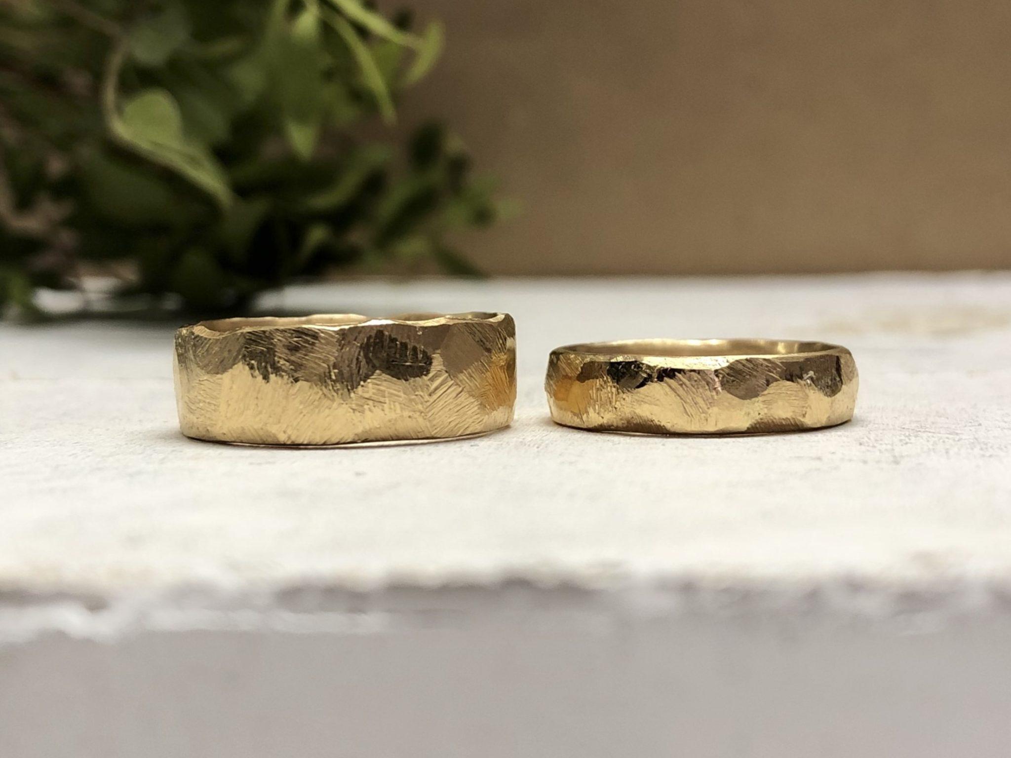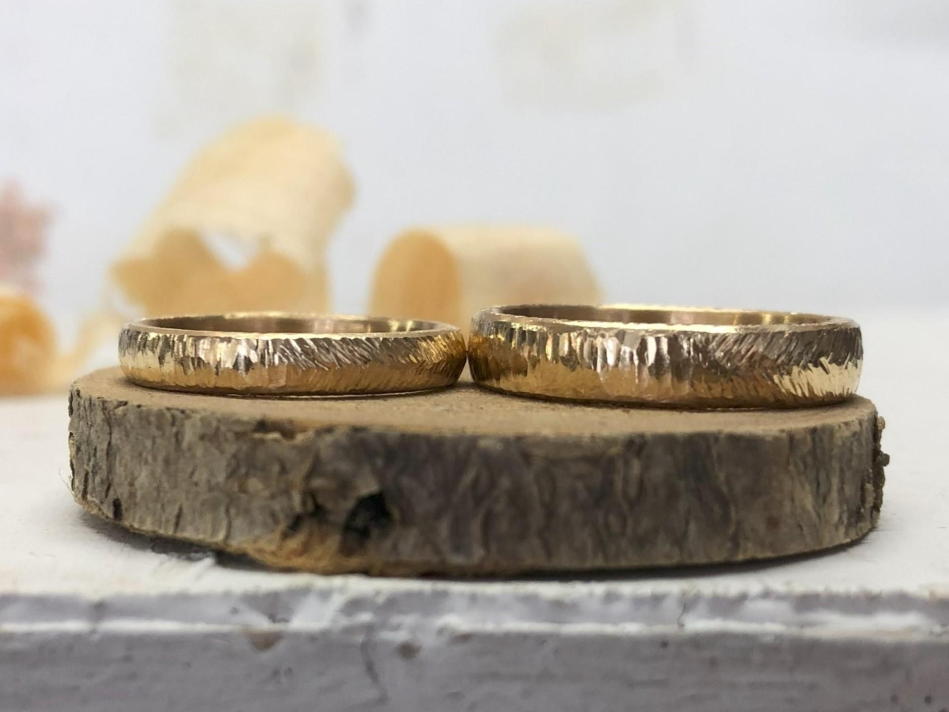 Die Ringe müssen nicht beide aus derselben Farbe und dem selben Feingehalt gefertigt werden. Die Ringe können aus je unterschiedlichem Goldgehalt/Farbe sein, beispielsweise Damenring 750 Gelbgold in Baumrindemuster und Herrenring 585 Graugold in Hammerschlagmuster.